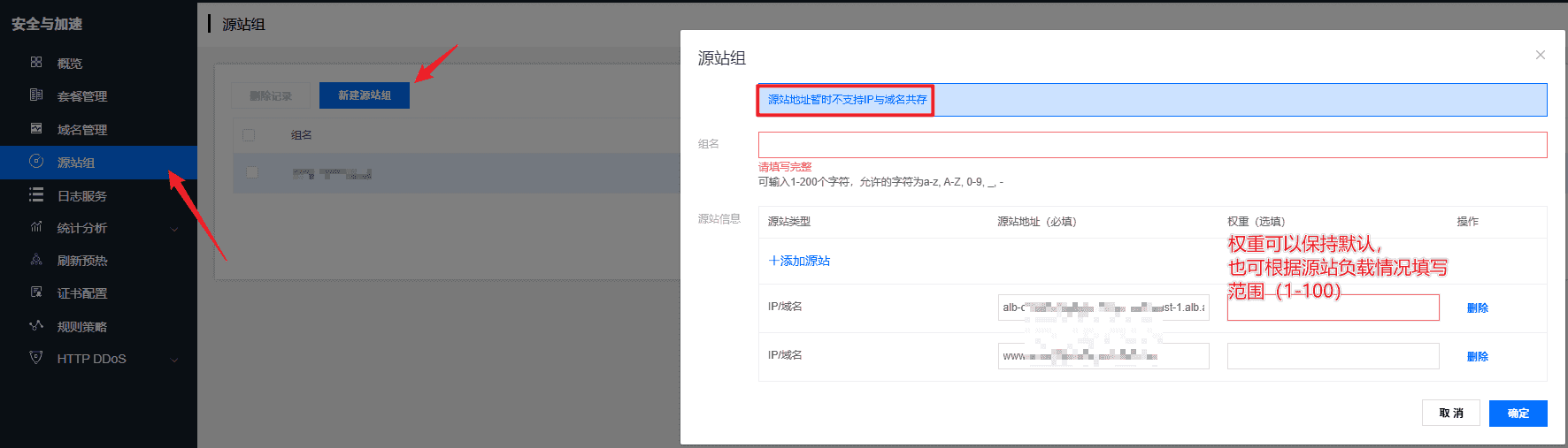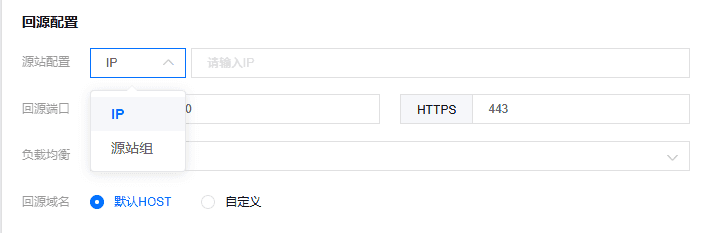 - 支持配置多个IP或域名作为源站,回源时会进行轮询回源,源站地址暂时不支持IP与域名共存。请在侧边栏点击源站组进行配置源站组。(如下图)