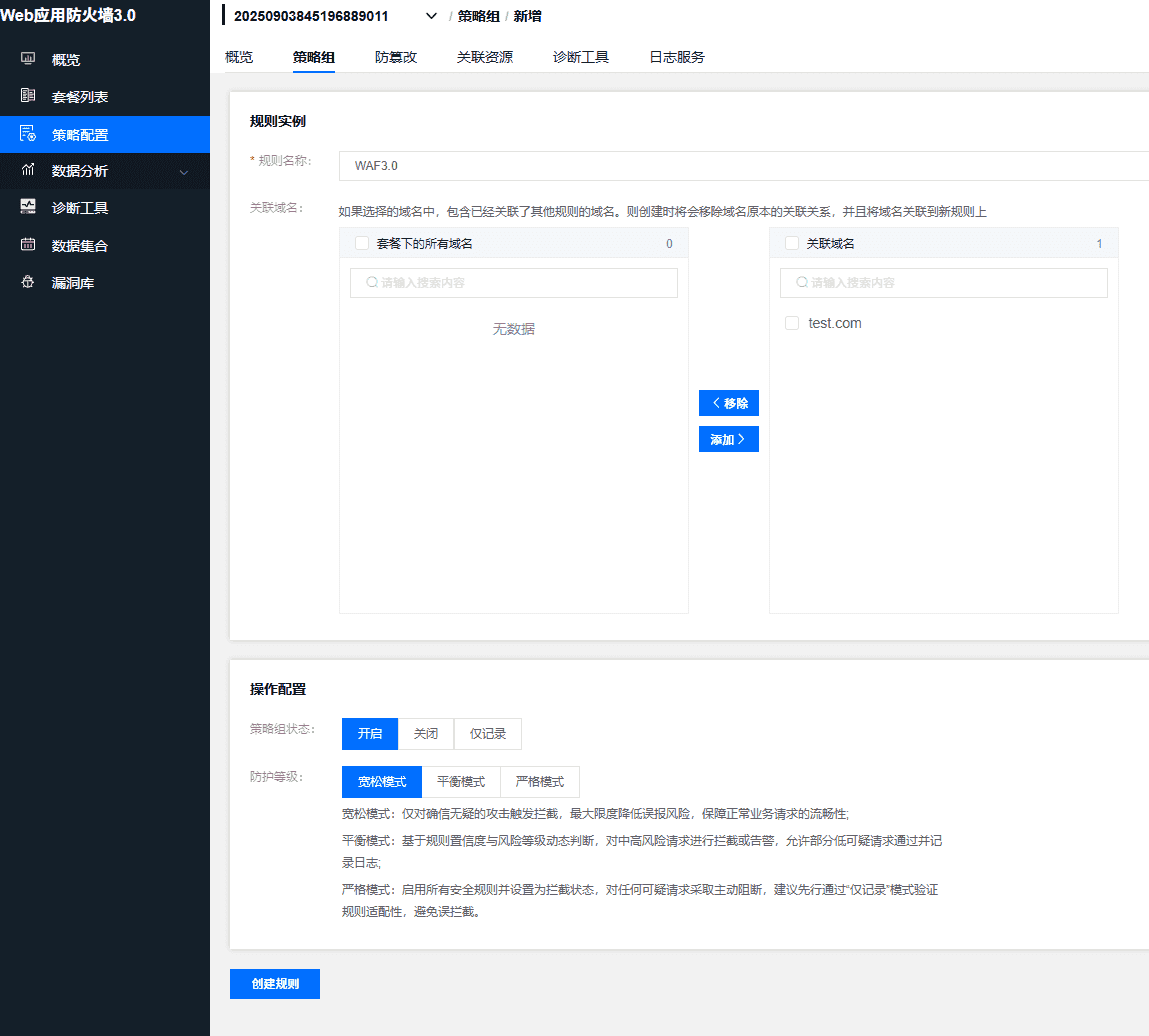 - 严格模式:启用所有安全规则并设置为拦截状态,对任何可疑请求采取主动阻断,建议先行通过“仅记录”模式验证规则适配性,避免误拦截。