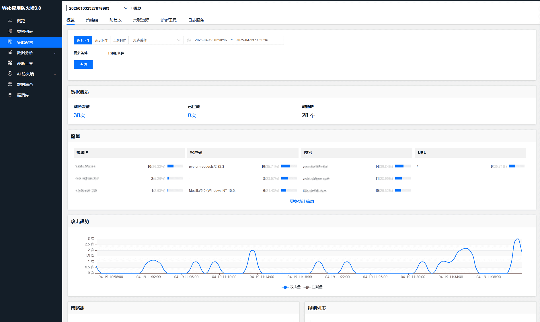 1. 在概览页面,可以查看近5分钟,近1小时但不超过近72小时的,并且并上(&)其他条件的数据概览,流量,攻击趋势,策略组和规则列表