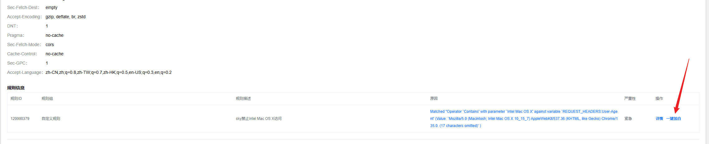 在日志服务中,可以查看详细数据,同时也可以提前一键对触发拦截规则的请求加白名单
