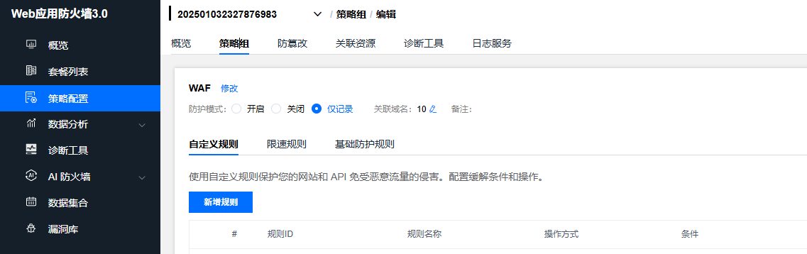 ● 菜单套餐列表->配置策略->策略组中选中相应 WAF 规则名称 拦截模式开启,针对自定义规则,限速规则,托管规则,配置的条件策略,及**OWASP**规则集存在的,可以对触发的策略有拦截动作