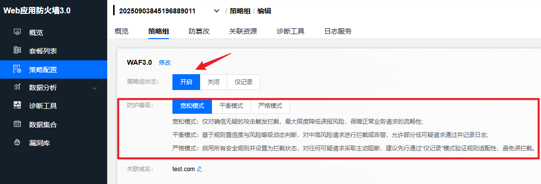 菜单“ 套餐列表->配置策略->策略组中选中相应 WAF 规则名称 开启仅记录模式预跑,可以提前发现一些可能存在的漏洞并对其进行修复,在此过程中,不会有拦截动作